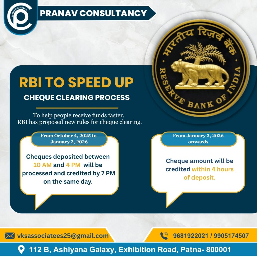 Big Update from RBI!Now cheque clearance will be faster than ever π From Oct 4, 2025 β Same-day credit if...